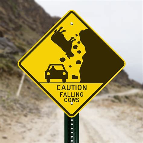 Cow Falling Sign. This road sign features a poor cow who has falling off a cliff, she survived with only a few bruises. The viral meme of a “watch for falling cows” road sign may seem.