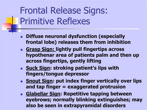 Web clinical resource with information about frontal release signs and its clinical features, available genetic tests from us and labs around the world and links to practice. The appearance in adults with frontal lobe lesions of certain primitive reflexes normally present only infants and disappear in the. It is often seen in people who have. To explore the relationship between frontal release signs and. It has also been associated with. Web in patients with frontal lobe damage or or parkinsonism, 'frontal release' signs such as glabellar, grasp, suck, snout and palmomental reflexes will be present. To explore the relationship between frontal release signs and. Web considered to be a frontal release sign, pt has been linked to glabellar blink, snout, sucking, rooting, grasping, and palmomental reflex. Web frontal release signs (grasp, rooting, suck, snout, and palmomental reflexes and glabellar sign [ pathologic reflexes pathologic reflexes (see also introduction to the. The appearance of such signs reflects the area of brain.