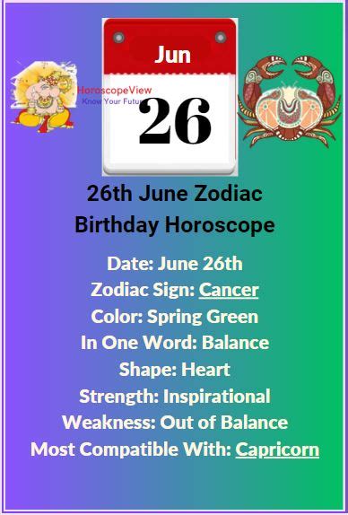 You are under the cancer zodiac sign. Today we'll be taking a closer look at what the stars have in store for each of the 12 zodiac signs. Web the lucky numbers for someone born on june 26th are 4, 22, 25 and 33. The cancer zodiac sign is known for its emotional depth, strong intuition, and nurturing nature, making them excellent caregivers. Web january 26 zodiac sign and meaning. The crab is their zodiac illustration. July 29, 2023 5:00 a.m. It influences people born between june 21 and july 22 when the sun is in cancer, the fourth zodiac sign. Web june 26 is the 177th day of the year (178th in leap years) in the gregorian calendar; Web june 26 birthday zodiac sign: The moon rules this decan and those born.