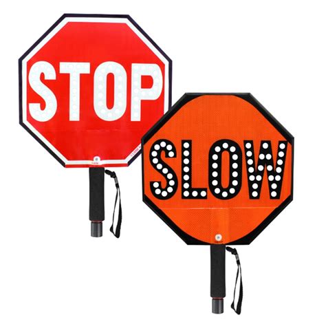 State & local requirements determine appropriate paddle size & paddle. 6″ tall lettering on both sides of the sign reading stop and slow. 52 white/stop face, 58 white/slow face. Using the same reflective coating as basic stops, led stop signs add a dimension of visibility with strobing lights around the outer edge. Web the outcome there could very well be a catastrophic — or even, fatal — accident. Push button activation and function control. This means that drivers will see them earlier, creating safer conditions. Web led stop / slow paddle. Sign faces composed of diamond grade reflective material. Over 12 hours continuous flashing operation per charge.