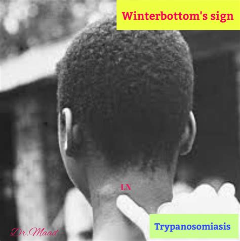 Winter Bottom Sign. Painless cervical lymphadenopathy in the posterior triangle of the neck; Palpable swelling of the skin of the lateral/posterior region of the neck as first sign of an infection with stages of trypanosoma brucei.